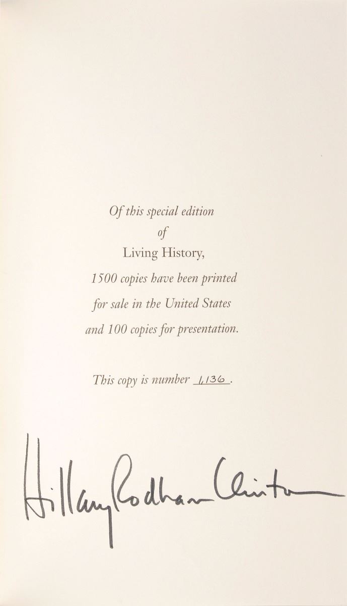 Signed book: Living History. Special limited edition, numbered 1136/1500. NY: Simon & Schuster. Hardcover with slipcase, 6.25 x 9.5, 562 pages. Signed on the colophon in black felt tip, "Hillary Rodham Clinton." In fine condition. Pre-certified PSA/DNA.