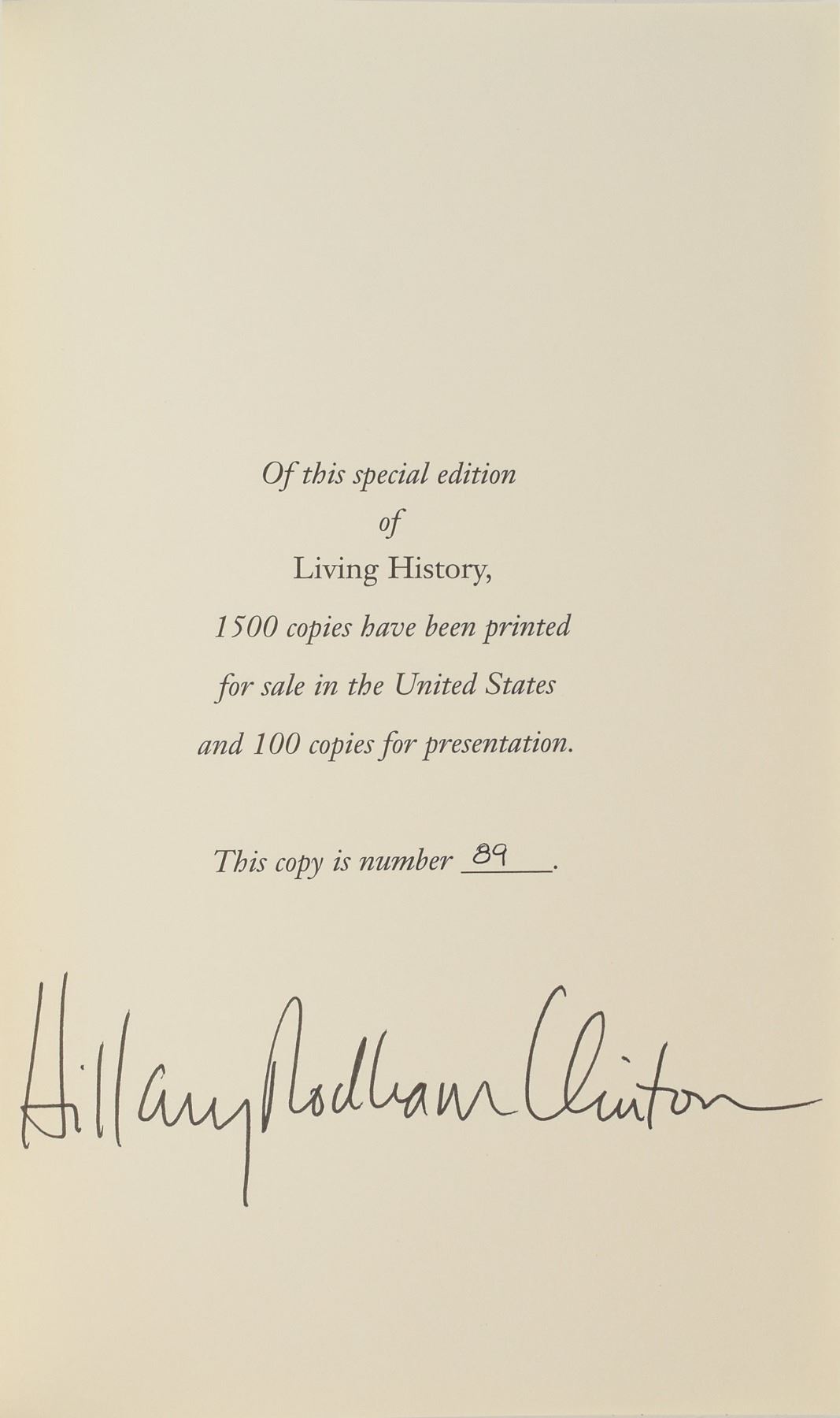 Signed book: Living History. Special limited edition, numbered 89/1500. NY: Simon & Schuster, 2003. Hardcover with slipcase, 6.55 x 10, 562 pages. Signed on the colophon in black felt tip, "Hillary Rodham Clinton." In very fine condition.