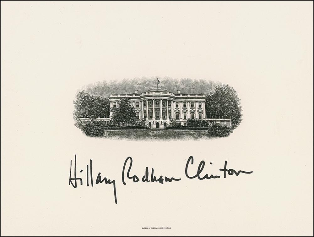 Superb engraved portrait of the White House, 8 x 6, by the Bureau of Engraving and Printing beautifully signed in black felt tip, “Hillary Rodham Clinton.” In very fine condition. RRAuction COA.