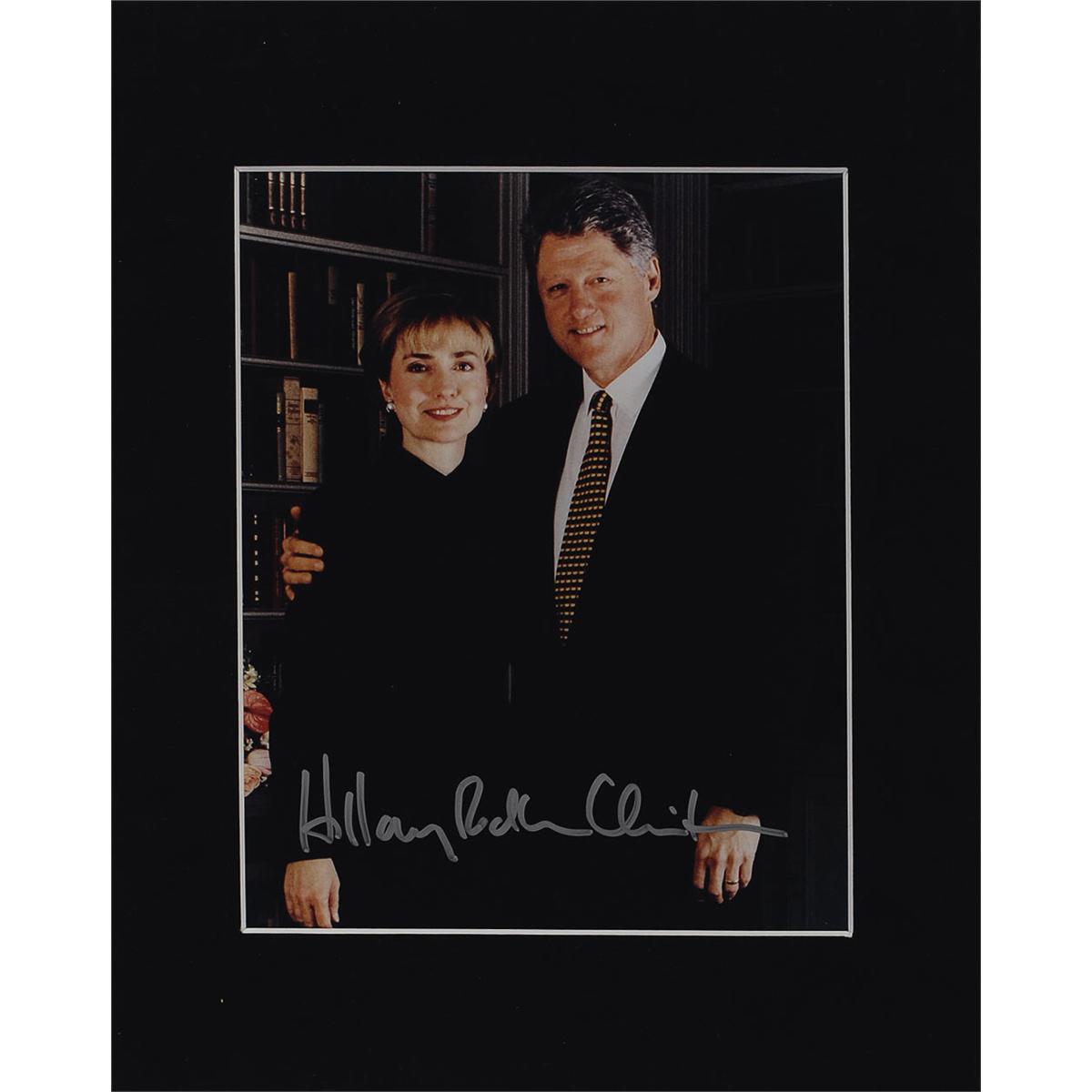 Color glossy 8 x 10 photo of Clinton posing with her husband, signed in silver ink, “Hillary Rodham Clinton.” Suede matted to an overall size of 11 x 14. In very fine condition.
