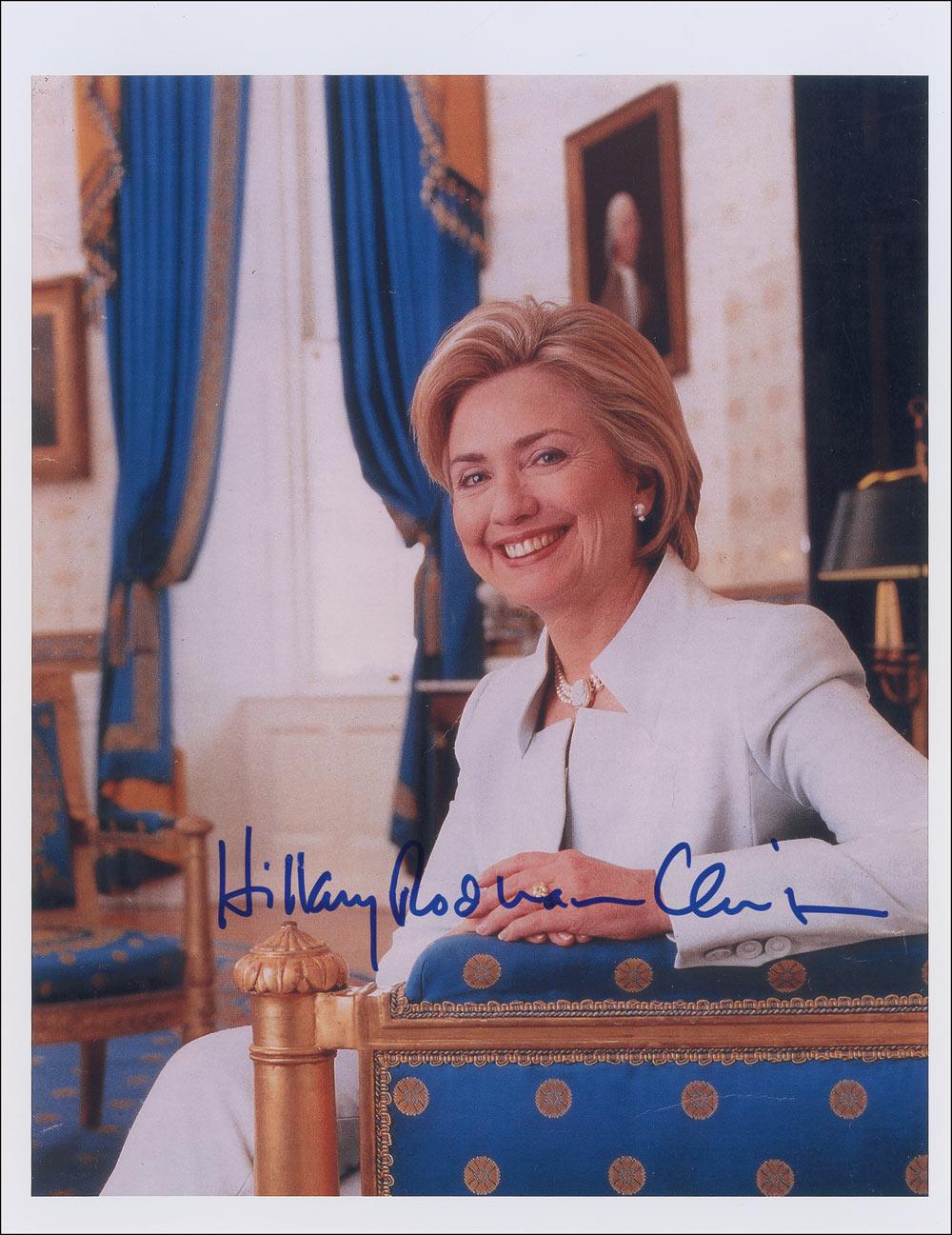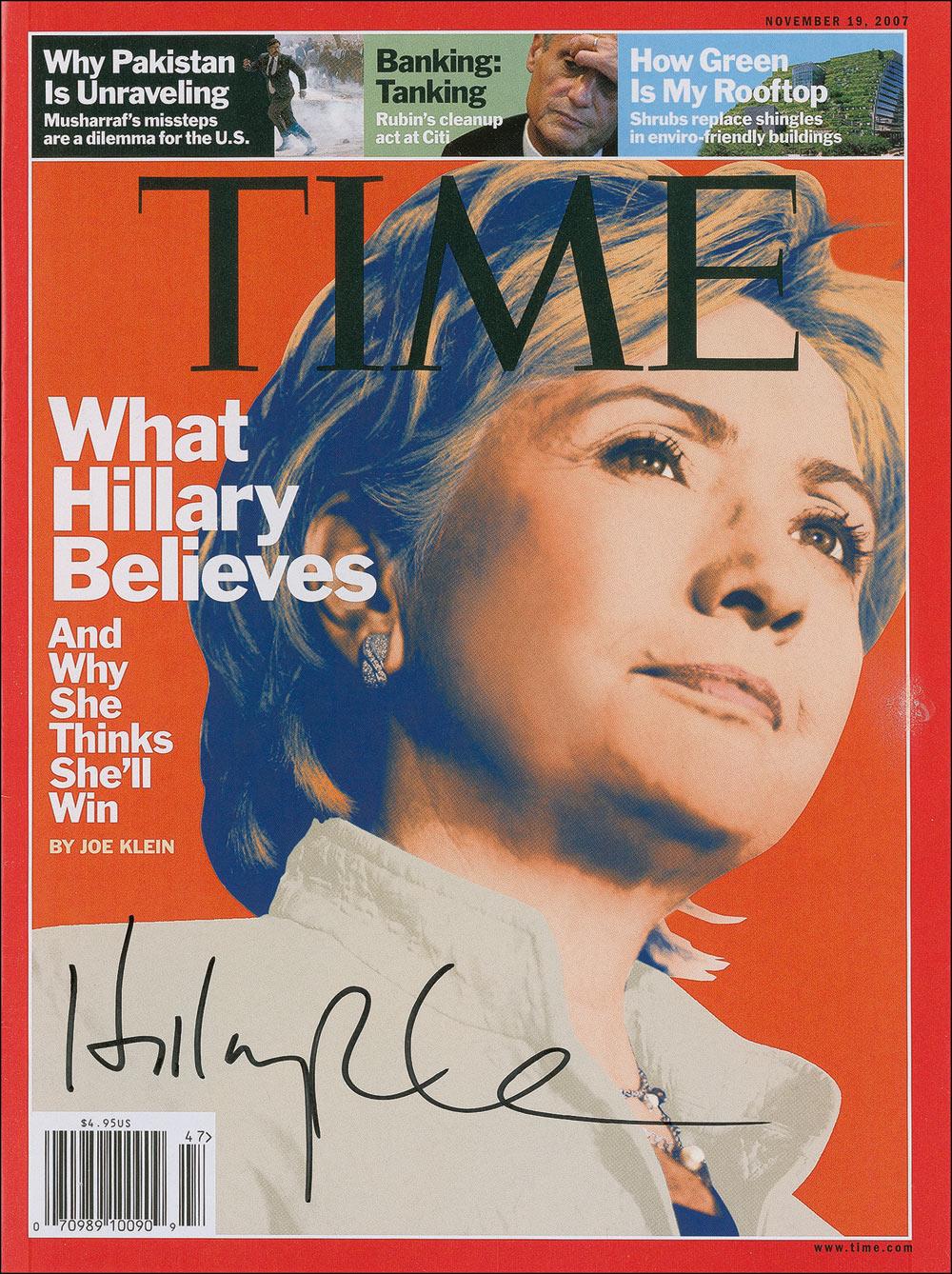 Two items: Time magazine, dated November 19, 2007, signed on the front cover in black felt tip; and a color glossy 8.5 x 11 photo of Clinton in the White House, signed in blue felt tip. In fine condition.