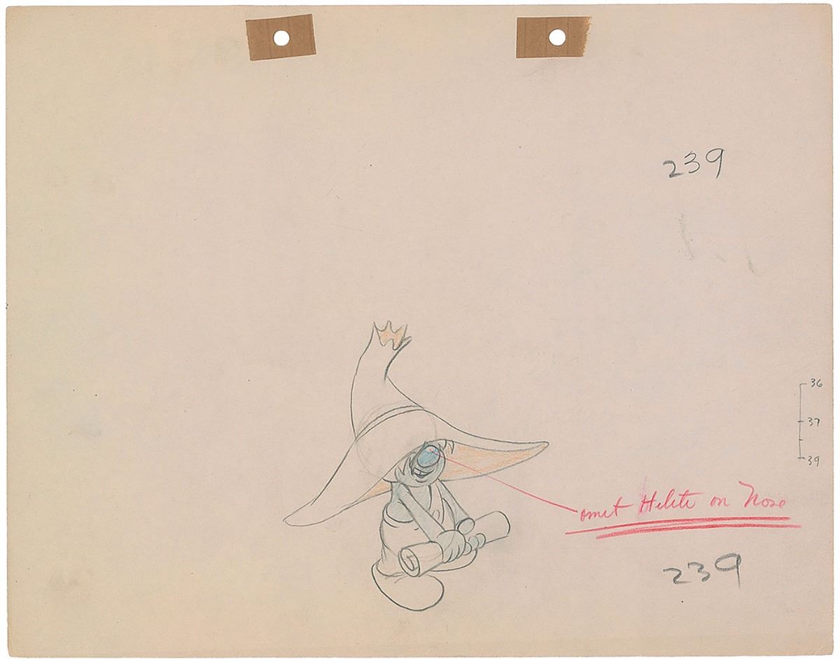 (Warner Brothers Studios, 1943) Original production drawing featuring Hillbilly Flea from An Itch in Time directed by Chuck Jones. Accomplished in graphite and colored pencil on untrimmed 12 x 9.5 animation paper. Image measures 4 x 4. In fine condition.