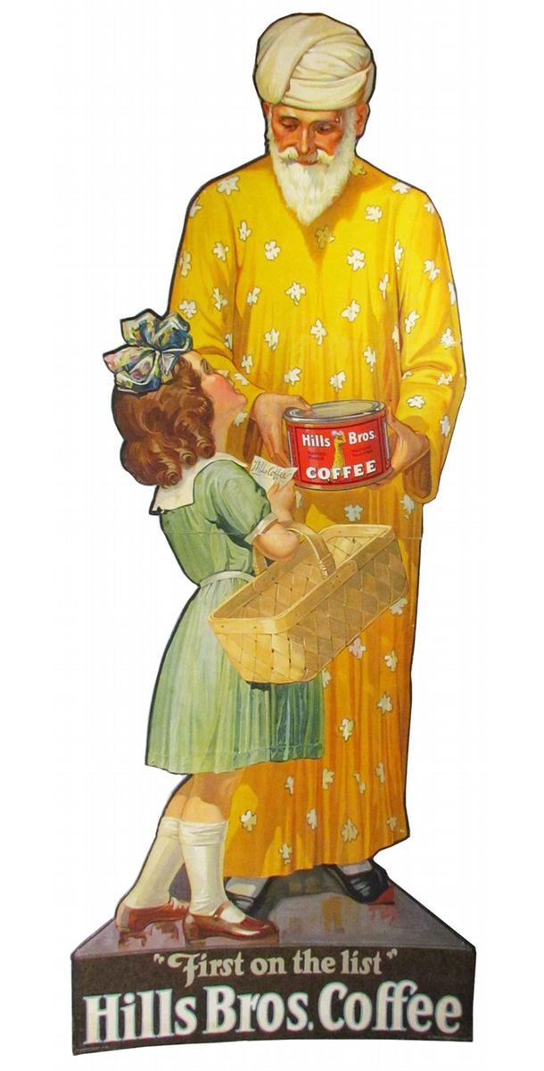 Hills Bros. Coffee Die Cut Cardboard Window Display with easel back. Small tear at elbow, two nail holes at 7:00 and horizontal fold crease otherwise excellent condition. 24 X 60 1/2 inches.