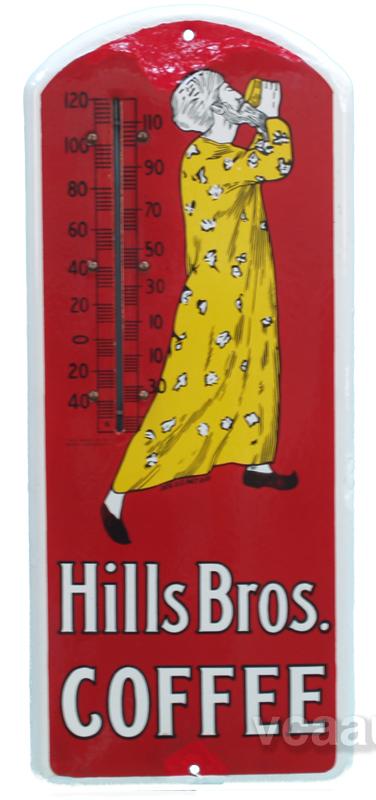 "Hills Bros. Coffee" Porcelain Sign w/ Thermometer, has some touch-up - 9" x 21"