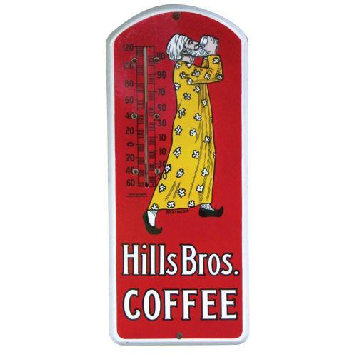 Hills Brothers Coffee Porcelain Thermometer. Near mint condition. Made by the Beach Co., Coshocton, OH. 9 X 21 inches.
