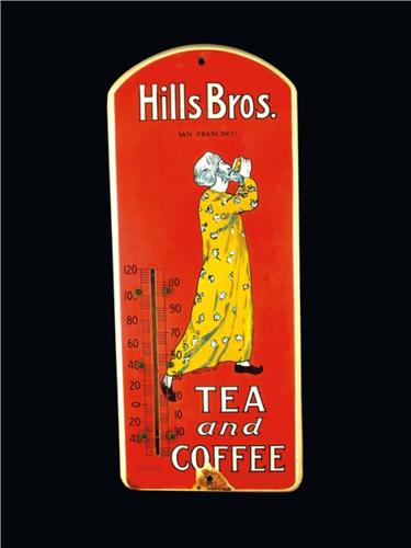 Hills Brothers Porcelain Tea and Coffee Thermometer, pat 1915. Chip at bottom grommet otherwise excellent condition. 9 X 21 inches.