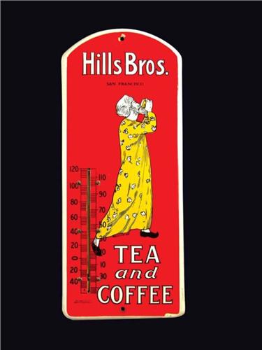 Hills Brothers Tea and Coffee Porcelain Thermometer, patent 1915. Slight damage to lower right corner otherwise excellent condition. 8 1/2 X 21 inches.