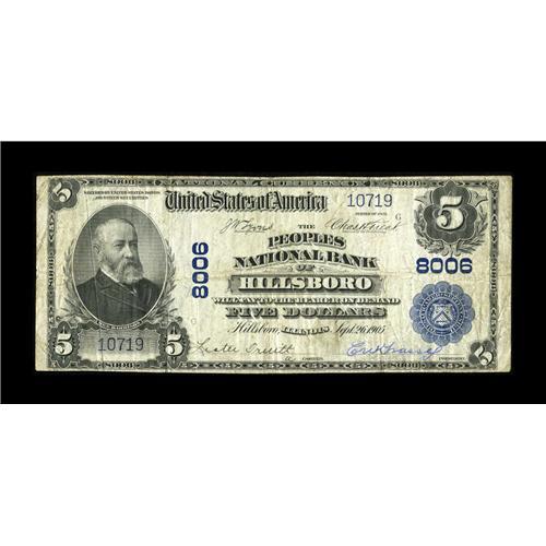 <B>Hillsboro, IL</B></I> - $5 1902 Plain Back Fr. 599 <B>The Peoples NB</B></I> Ch. # 8006<BR>The census from here now aggregates just 10 documented large survivors. The example we offer tonight bears the signatures of the Assistant Cashier and Vice-President and is an overall quite attractive <B>Fine+</B></I> with some claims to the next higher grade. The successful bidder will likely need to bid in the range of...<BR><BR><b>Shipping:</b> Coin/Currency (<a target="_blank" href="http://www.heritageauctions.com/common/shipping.php">view shipping information</a>)