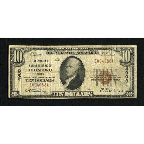 <B>Hillsboro, TX</B></I> - $10 1929 Ty. 1 <B>The Citizens NB</B></I> Ch. # 4900<BR> Here is another evenly circulated example from this popular Hill County institution. <B>Very Good</B></I>.<BR><BR><b>Shipping:</b> Coins & Currency (<a target="_blank" href="http://www.heritageauctions.com/common/shipping.php">view shipping information</a>)
