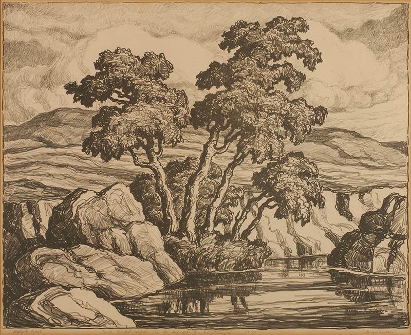 Birger Sandzen, 1871 - 1954 TSA | Signed: Birger Sandzen, l/r; Hillside Brook, l/l; With kindest regards to Mr. and Mrs. C.A O'connor 1938, l/c| Media: Lithograph | Dimensions: 16 by 20 inches