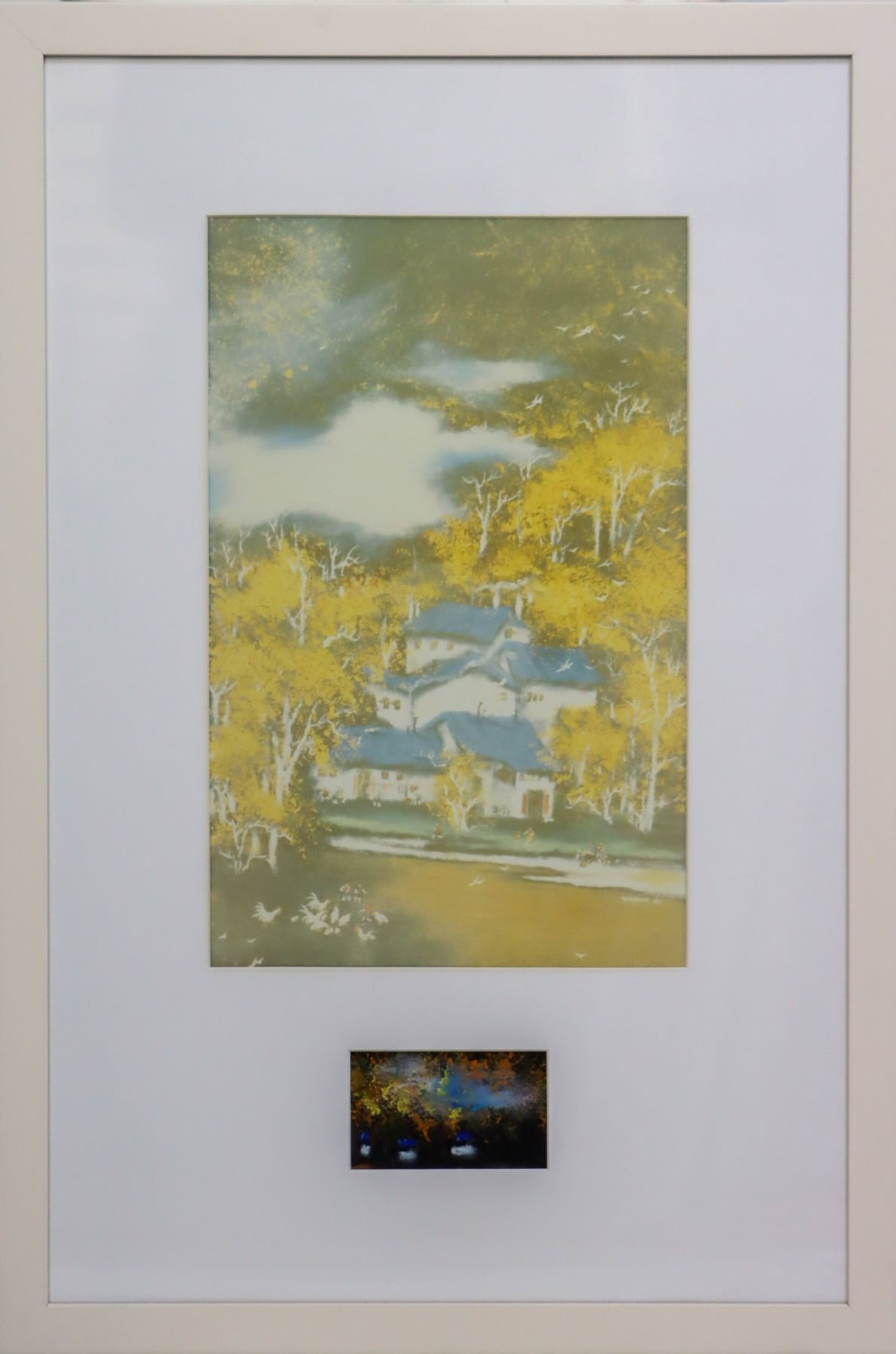 Matted and framed under glass, a lovely hillside landscape of blue roofs among yellow trees.