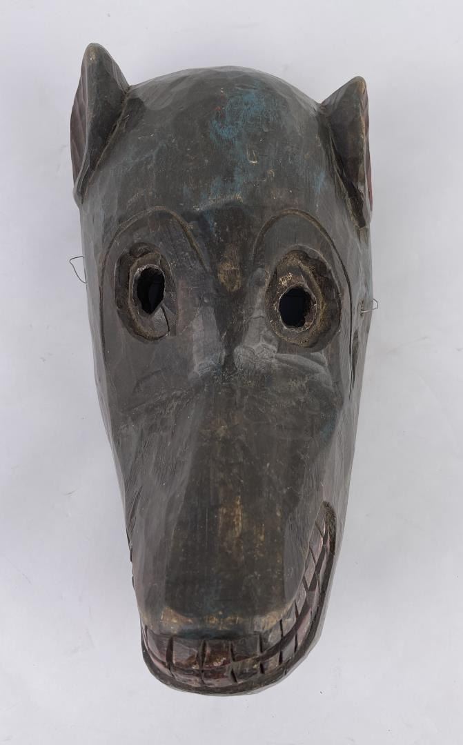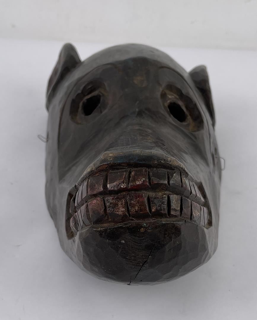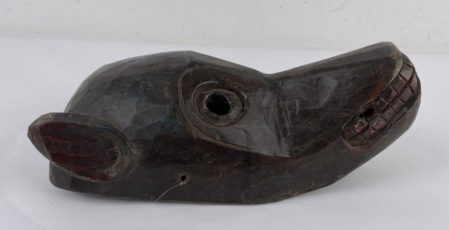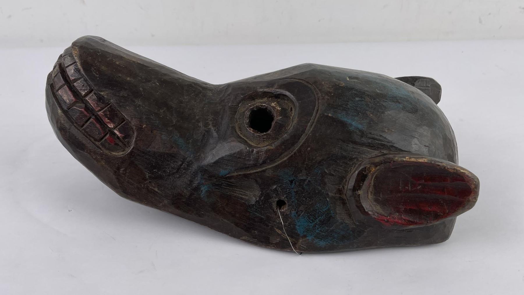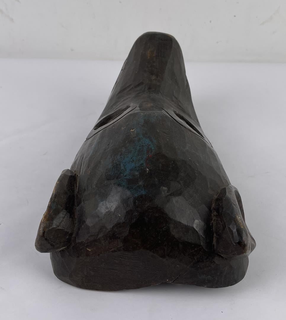 Himalayan in origin. Smiling monkey, some traces of paint remaining. 13" long, 6" wide.