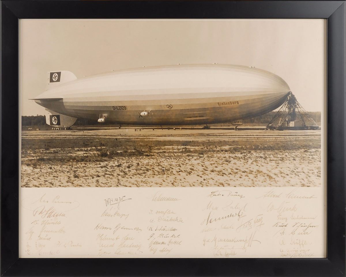 Extremely scarce circa 1936 matte-finish 19.25 x 15 photo of the infamous Hindenburg, signed in the lower border in fountain pen by thirty-seven members of its forty-man crew, including all of the ranking officers as well as other notable names from the disaster; of these signers, thirty-one were on the airship when it exploded and twenty-three survived. Framed and in fine condition.