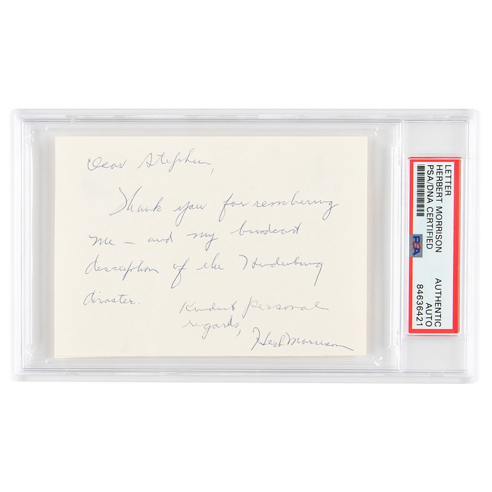 ANS signed “Herb Morrison,†one page, 4.75 x 3.5, no date. Handwritten note to "Stephen," in full: "Thank you for remembering me—and by broadcast description of the Hindenburg disaster." In very fine condition. Encapsulated in a PSA/DNA authentication holder.