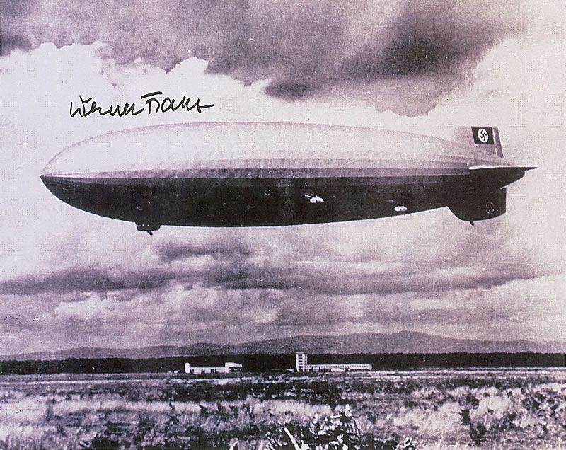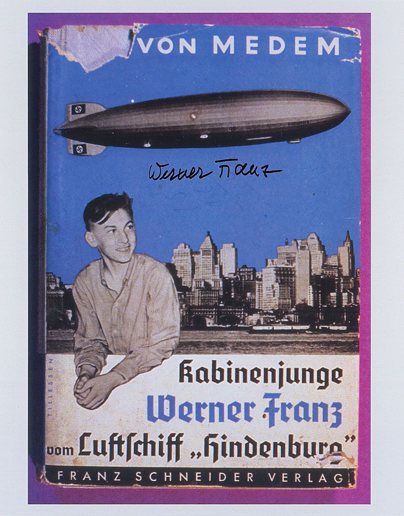Fourteen-year-old cabin boy who survived the final flight of the Hindenberg. One 10 x 8 cardstock photo of the Hindenburg in flight, signed in black felt tip; and one color 8 x 10 cardstock photo of a book cover, signed in black felt tip. In overall fine condition.