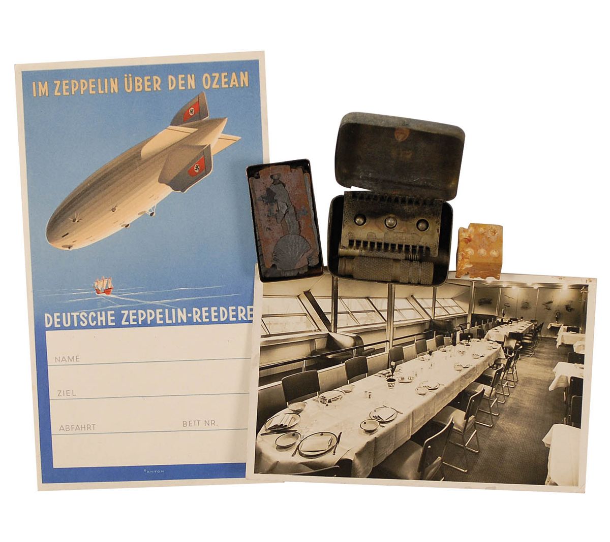 Collection of five items, including three relics recovered after the 1937 crash. Items are: a charred gentleman’s collapsible travel razor in metal case, measuring 2 x 1.25 x .75; a charred set of spare razor blades in metal case measuring 2 x 1 x .25; and a remnant of a die, possibly Bakelite, from a pair of dice, heavily chipped. Six dot side, most of two dot side and half of three, four and five dot sides present, with separate remnant of one dot side. All three relics were recovered from the May 6, 1937, crash site by a Lakehurst firefighter. Also included are: an in-flight ALS on a 5.5 x 3.5 picture postcard of the Hindenburg dining room, dated June 21, 1936. Postcard reads, “A remarkable crossing. Very spacious public rooms & staterooms. Two floors of passenger accommodations. Perfect weather, no vibration & steady as a rock. Now flying about 1000 ft above the water. Go over Ireland tonight.”; and an unused color 4 x 7 luggage label from the German Zeppelin Shipping Company with spaces to fill in “personal information and bed number.” In fine condition, with aforementioned expected charring and damage to relics. Provenance: Bonham’s: San Francisco, 2008.