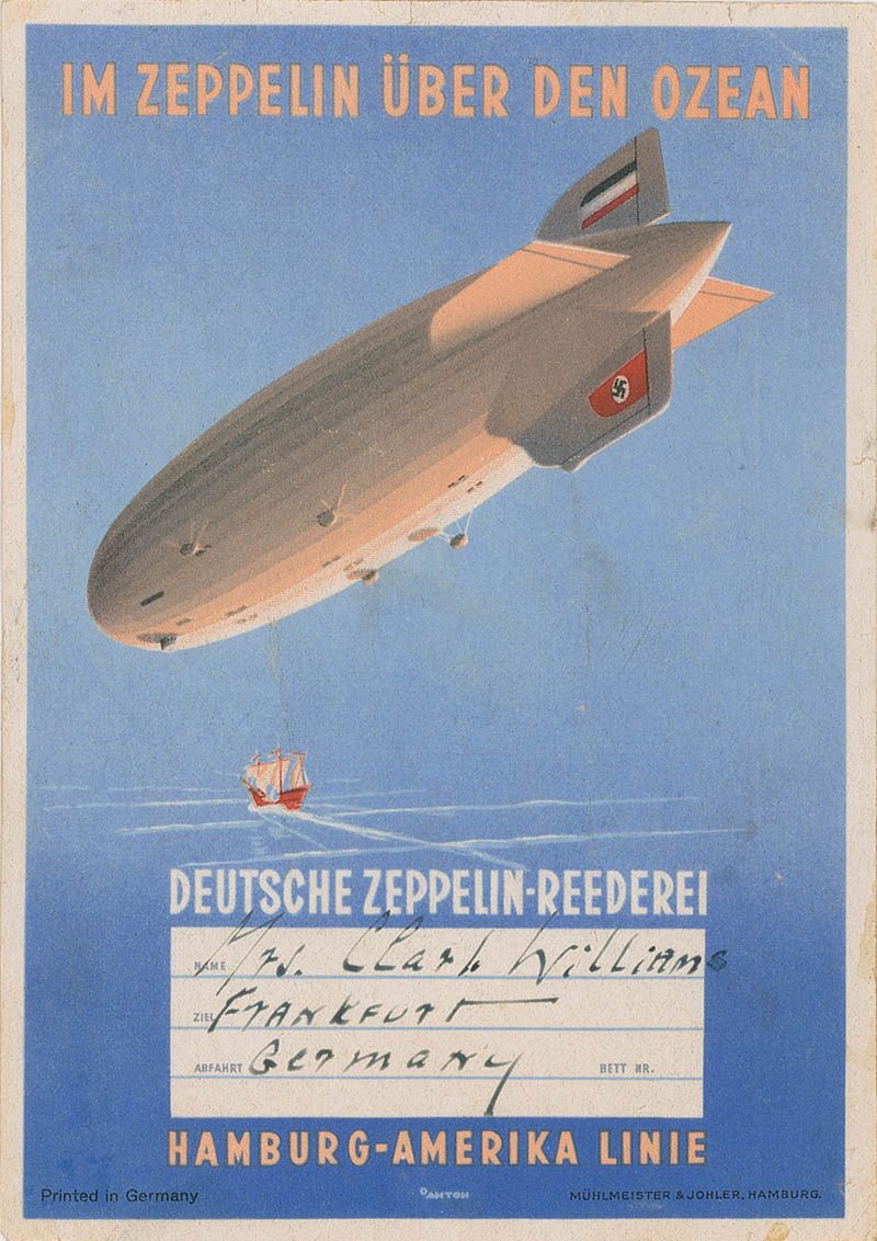 Color Hindenburg baggage tag, 4 x 6, with an image of the Hindenburg flying over the water, with a large sailboat below, and personal information added for Mrs. Clark Williams of Frankfurt, Germany. A couple vertical creases and some scattered light toning and soiling, otherwise fine condition.
