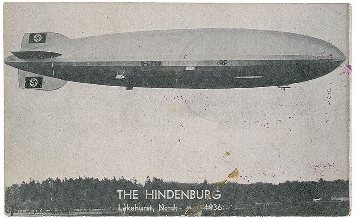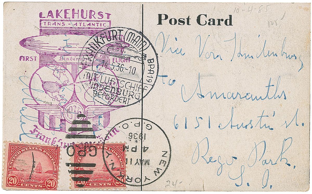 Vintage postcard, 5.5 x 3.5, of the Hindenburg over Lakehurst, New Jersey, in 1936. Reverse is addressed to a woman, and features a German postmark for the card’s arrival at Frankfurt on May 14, 1936. In very good condition, with scattered soiling to image side, as well as light show-through and impressions from cancellations, and some light toning and pencil notations to correspondence side.