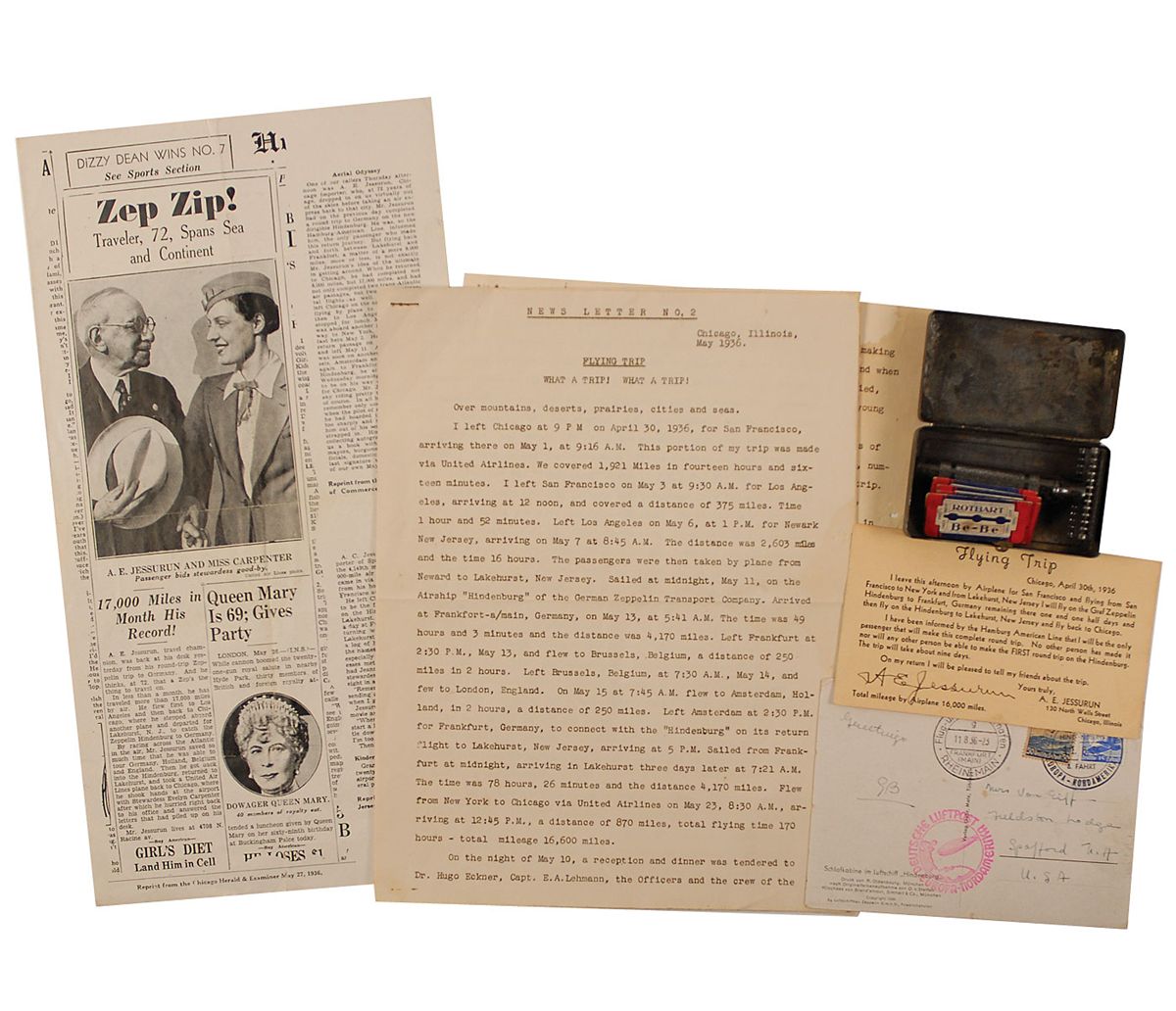Printed Manuscript, signed in facsimile “A. E. Jessurun,” 10 pages, 8.5 x 11, May 1936. Headed “News Letter No. 2.” and titled “Flying Trip What a Trip! What a Trip!” Narrative of his trip by air, leaving Chicago on April 30, 1936: Chicago-San Francisco-Los Angeles-Newark-Lakehurst and then, aboard the “Hindenburg,” to Frankfurt, Germany, arriving on May 13, 1936. Jessurun details his experiences on his flights aboard the Hindenburg, including a conversation with Dr. Hugo Eckener, commander of the flight. Jessurun describes an incident occurring as the Hindenburg returned to Lakehurst. In part, “For a moment I experienced the sensation of falling through space, when as abruptly everything seemed righted and we were flying along smoothly. Upon inquiring, I found that one of the men in the Control Room had accidently pulled the wrong lever causing the Airship to go down, but had discovered his error immediately. The passengers remained very calm, and the Captain assured them there was no danger.”