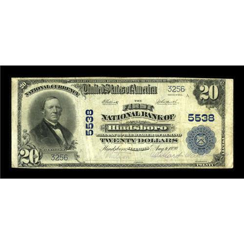 <B>Hindsboro, IL</B></I> - $20 1902 Plain Back Fr. 659 <B>The First NB</B></I> Ch. # 5538<BR>This attractive issue is the finer of only two known Plain Back $20's from this bank. <B>Fine.</B></I><BR><I>From The Lincoln Collection</B></I><BR><BR><b>Shipping:</b> Coins & Currency (<a target="_blank" href="http://www.heritageauctions.com/common/shipping.php">view shipping information</a>)