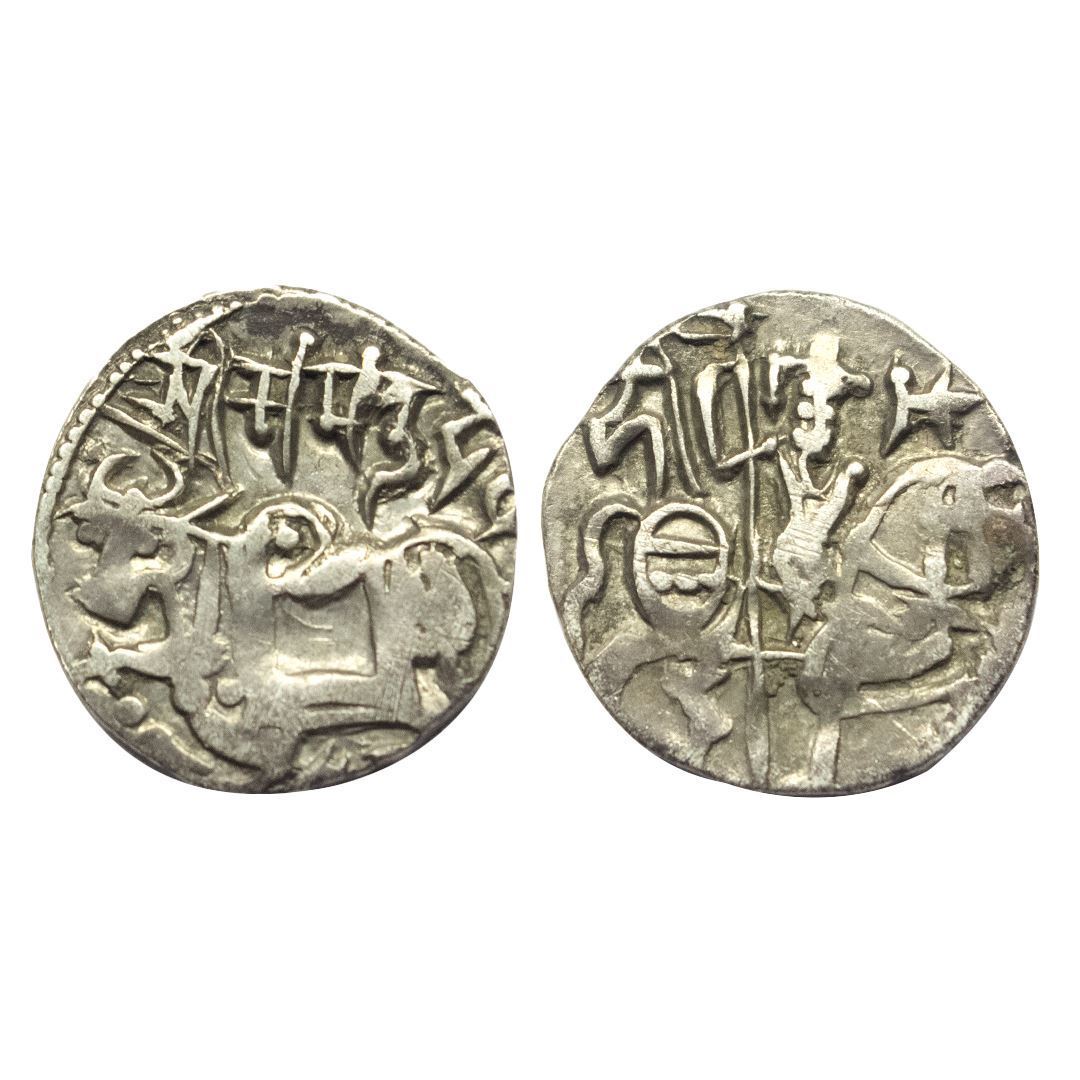 Hindu Medieval, Hindu Shahis of Kabul and Ohinda, Samantadeva (c. 850-1,000 AD), Silver Jital, 3.26Grms, Obv: Recumbent bull facing left with Sarada legend ’Sri Samantadeva', Rev: Rider on a caparisoned horse with legend 'Ha' next to the rider. (J. Deyell 44). Very Fine+.
