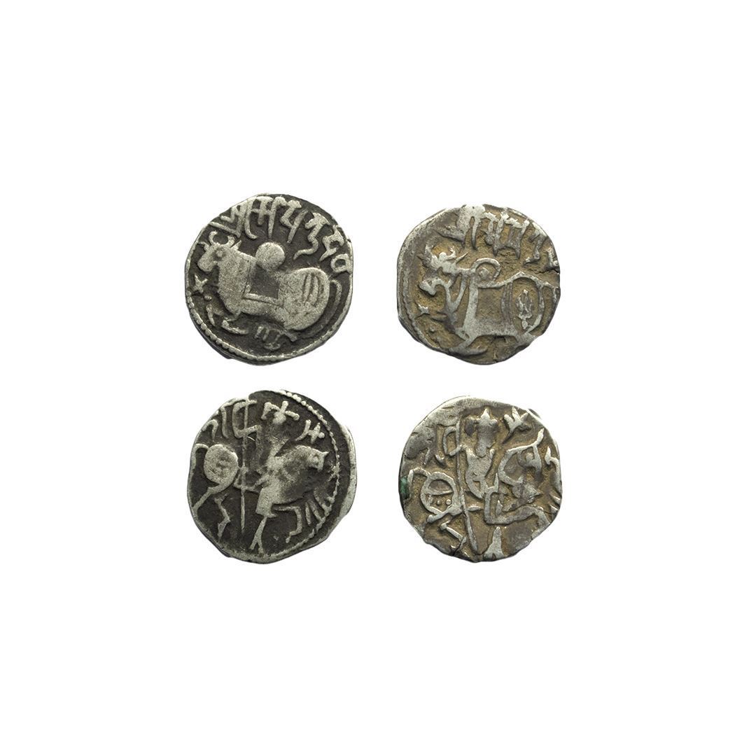 Hindu Medieval, Hindu Shahis of Kabul and Ohinda, Spalapati (c. 750-850 AD), Silver Jital (2 coins), Obv: Recumbent bull facing left with Sarada legend ’Sri Samantadeva', Rev: Rider on a caparisoned horse with legend 'Ha' next to the rider.
