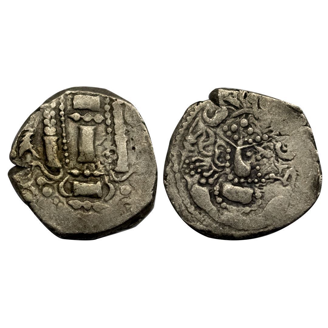 Hindu Medieval, Indo Sassanian type, Anonymous issue from NW India, (7th-8th Century AD), Billon Unit, 4.00 gms, Obverse: Bust of King to right within a dotted border, An elobarate diadem on the king’s head, Reverse: A crude depiction of the Sassanian fire altar flanked by attendents, fine to very fine, scarce.