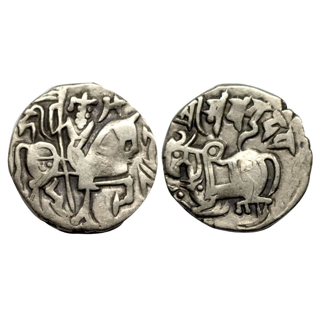 Hindu Shahis of Kabul and Gandhara, Samantadeva (9th-10th Century AD), Silver Unit, 3.27 gms, Obverse: depicted Horse rider to right, Reverse: Recumbent bull to left, Sharada legend above “Shri Samantadevah”, Tye # 14, very fine, scarce.