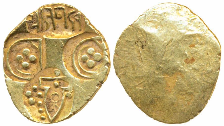 Paramaras of Vidarbha, Jagadeva, Gold Pagoda, 3.68g, punches of temple showing a human being, probably Shiva, 'Sri Jagadeva' in Nagari and two punches of a geometrical D shaped design on obv., uniface (see A. S. Thakur, ICSN 48). Extremely Fine. Rare.