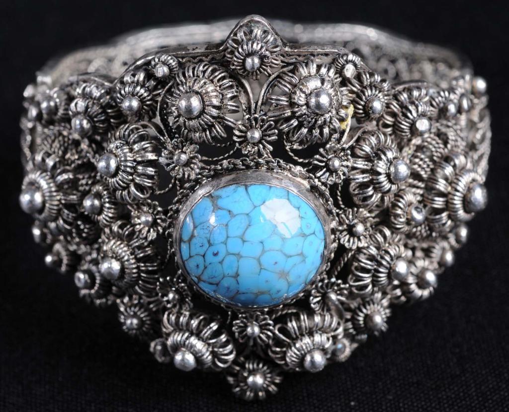 Description Marked "900". Turquoise colored stones. Condition (Excellent). Size 2 - 7/8" Dia.