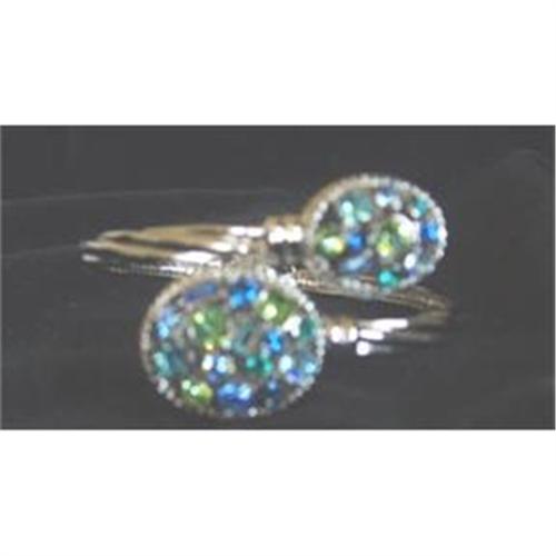 This is a beautiful hinged bracelet watch by Maggie Sweet. The larger of the two ovals opens up to a quartz watch. Both of the ovals are studded with stones in blues and greens. The back of the watch is stainless steel. Japan movement. Base metal bezal. This is a stunning piece by Maggie Sweet.