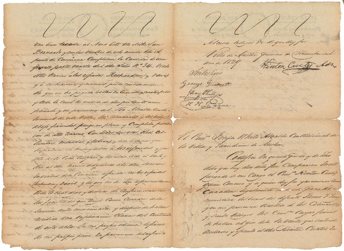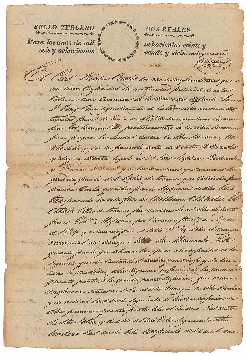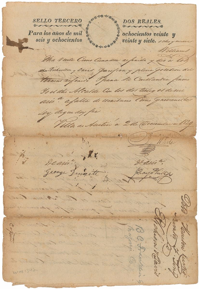 Manuscript DS in Spanish, four pages on two adjoining sheets, 8.5 x 12.5, December 1, 1829. As executor of the estate of James F. Tong, Hinton Curtis sells property to Stephen Richardson and Thomas Davis to meet the debts of the estate. Signed at the conclusion by Hinton Curtis, Joseph White as constitutional alcalde of San Felipe de Austin, and witnesses George Dimmitt, J. Ray Phillips, and H. H. League. In very good condition, with partial separations to folds, toning, and show-through from writing to opposing sides. Accompanied by a complete English translation. Curtis, White, and League were all members of Stephen F. Austin's Old Three Hundred colonists, as was the late Tong. Curtis also served in Capt. John Austin’s company and saw action at the Battle of San Jacinto. Provenance: The Robert Davis Collection.