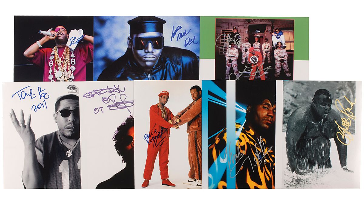 Eight glossy and satin-finish photos, 8 x 10 and 10 x 8, six color, each signed in ink or felt tip by the respective artist(s) pictured. Signers are: Tone-Loc, Special Ed, Rob Base, Chubb Rock, Slick Rick, Public Enemy, Kool Keith, and Kool Moe Dee. In fine condition.