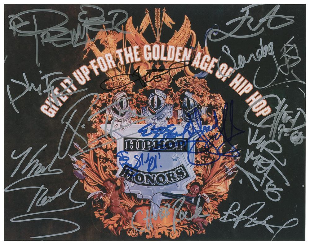 Color satin-finish 14 x 11 photo of the logo for VH 1’s Hip Hop Honors, signed in silver ink by 16 hip hop legends: Slick Rick, KRS One, Public Enemy including Chuck D & Flavor Flav, Ice-T, A Tribe Called Quest including Q-Tip & Phife Dog, EPMD including Erick Sermon & Parrish Making Dollars, Method Man of Wu-Tang Clan, Cypress Hill including B Real & Sendog, Chubb Rock, Kool Keith, DJ Premier of Gang Starr, and DJ Jazzy Jeff. In very fine condition.