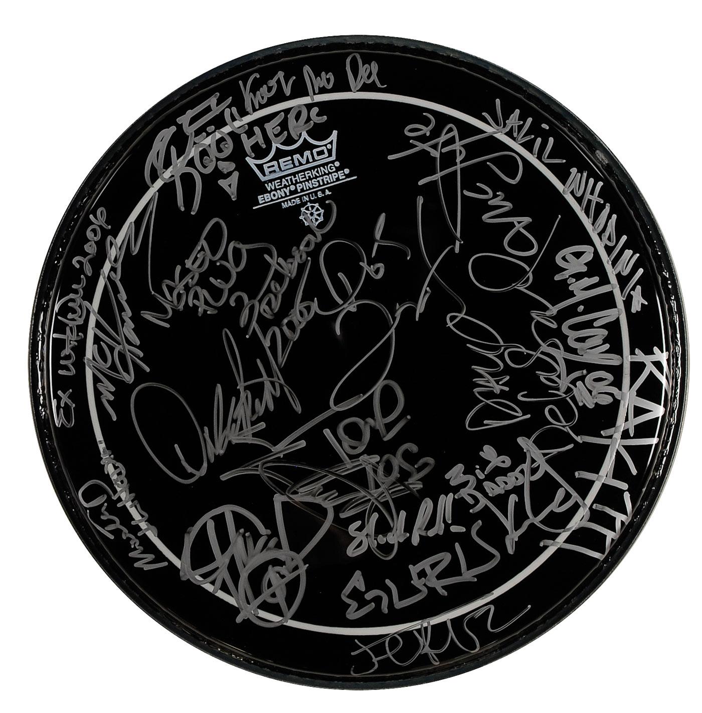 Unused 10” ebony Remo drumhead, signed in silver ink by 19 legendary Hip Hop/Rap musicians. Signers are: Chuck D of Public Enemy, Rakim, Slick Rick, LL Cool J, Doug E. Fresh, Guru of Gang Starr, Big Daddy Kane, Whodini (Jalil, Ecstacy, Grandmaster D), Kool Mo Dee, MC Hammer, De La Soul (Pos, Dave, Maseo), DJ Kool Herc, Grandmaster Caz of the Cold Crush Brothers, Tone Loc, MC Lyte and Jeru the Damaja. In very fine condition.