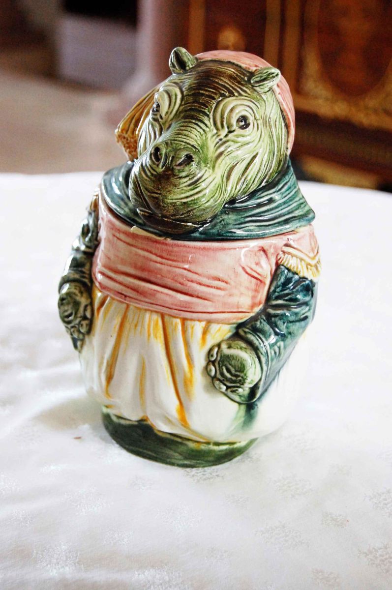 Hippo Tobacco Humidor. Hippo dressed in turkish attire. Signed "WW & S" on base. Excellent condition. 7 7/8 inches tall.