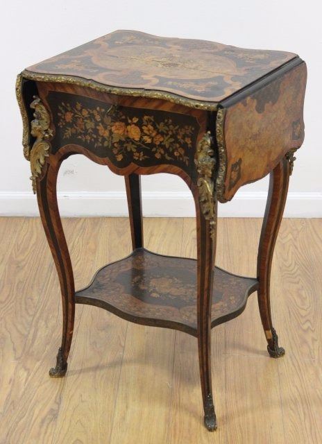Gilt bronze mounted. Drop leaf. Floral marquetry throughout. 4 espagnolette mounts. 2 drawers behind front panel. Bottom shelf with marquetry panel. Approx. 29" H x 34" W, open approx. 18 1/2" D, closed approx. 15" D. Hippolyte-Edme Pretot (1812-1855). Crack to top panel and minor veneer loss.
