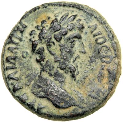 Hippos. Marcus Aurelius, 161-180 CE. AE 24. Laureate and bearded bust right of the emperor. Reverse: Tyche standing with horse. Ros. 9. Choice Very Fine.