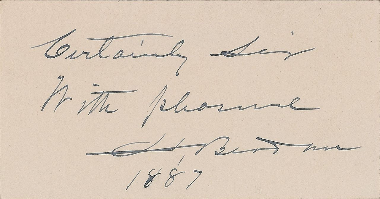 Engineer, inventor, and Civil War officer (1824-1893) who was a world-renowned marksman and the inventor of the Berdan rifle and other weapons. Rare ink signature, "Certainly sir, with pleasure, H. Berdan, 1887,” on an off-white 5 x 2.75 card. In very fine condition.