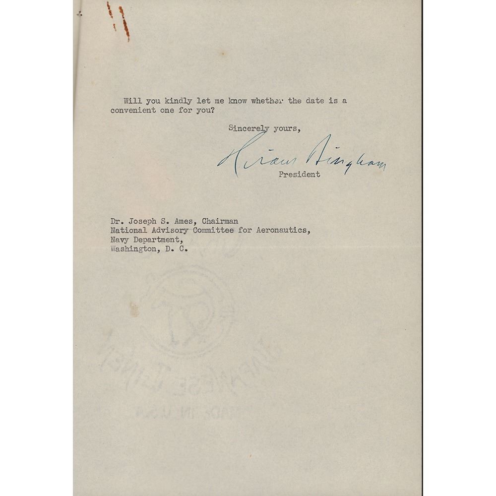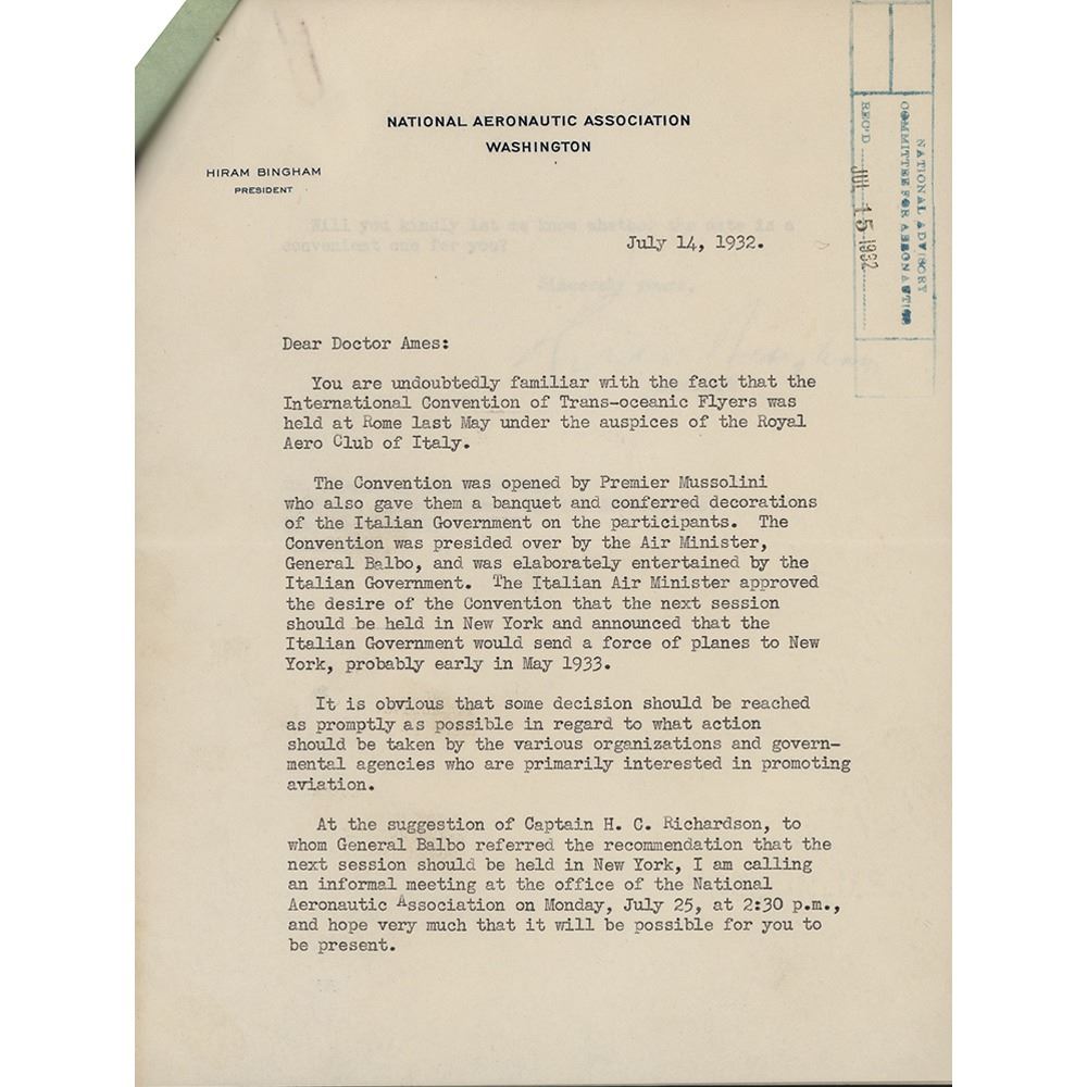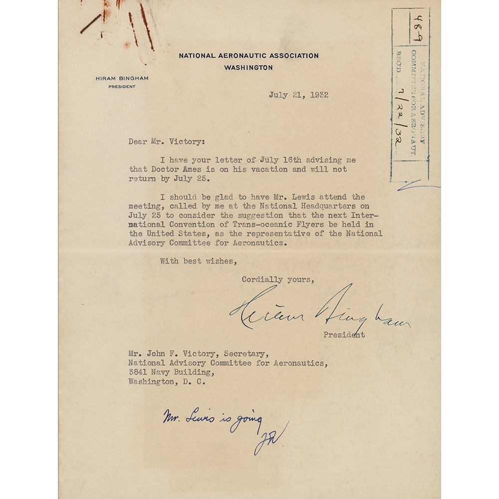 United States senator and explorer who discovered Machu Picchu (1875–1956). Two TLSs from Hiram Bingham, dated July 14 and 21, 1932, typed on his personal 7 x 9.25 National Aeronautic Association letterhead. The earlier letter, sent to Dr. Joseph S. Ames, chairman of the National Advisory Committee for Aeronautics, references the 1931 International Convention of Trans-oceanic Flyers held in Rome and presided over by “Premier Mussolini” and “the Air Minister, General Balbo,” the latter who “approved the desire of the Convention that the next session should be held in New York and announced that the Italian Government would send a force of planes to New York, probably early in May 1933.” Hingham closes by calling for an informal meeting to discuss the proposed next session. Stapled to the front is the carbon copy reply from Ames’s secretary and Hingham’s second TLS, in which he accepts George W. Lewis to serve as Ames’s representative at the meeting in his stead. In overall fine condition, with rusty paperclip impressions to one of the letters.
