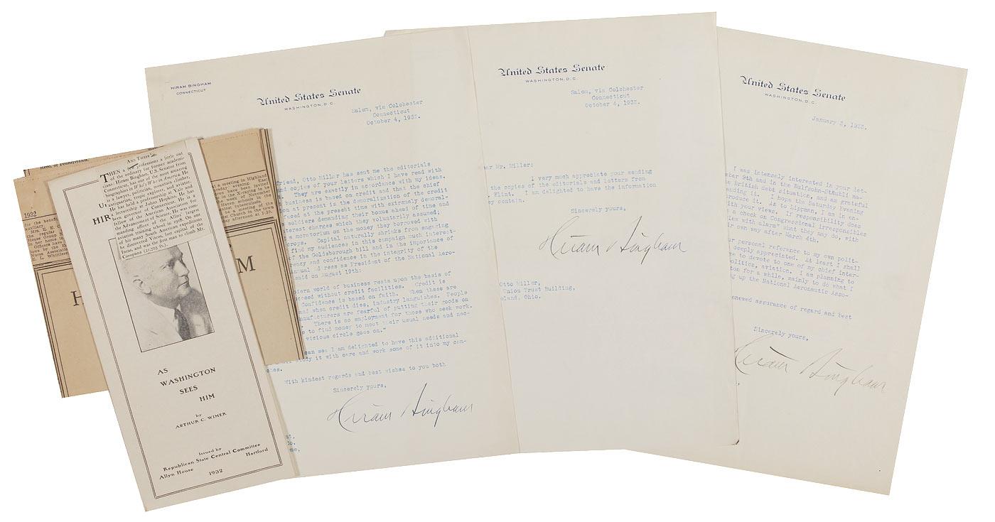 United States senator and explorer who discovered Machu Picchu. Three one-page TLSs, all on United States Senate letterhead, two from 1932 and one from 1933. Two of the letters are to physician Joseph M. Flint, including one regarding the world economic crisis. In part: "Your friend, Otto Miller has sent me the editorials of Wulf's son-Staubli and copies…which I have read with the greatest interest…I firmly believe that business is based on credit and threat the chief cause of the depression at present is the demoralization of the credit mechanism. We are faced at the present time with extremely demoralizing tendencies.” In fine overall condition, with small pin holes to the upper left corner of two of the letters. Accompanied by several related captions and clippings.