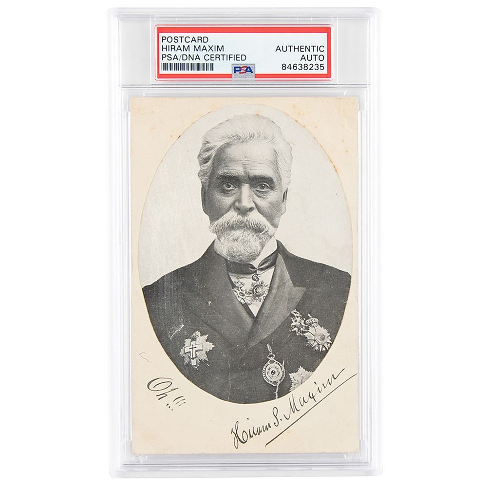 Vintage 3.5 x 5.5 postcard featuring an affixed oval portrait of Maxim, signed below in ink, "Oh!!! Hiram S. Maxim." In fine condition, with light foxing and creasing. Encapsulated in a PSA/DNA authentication holder.