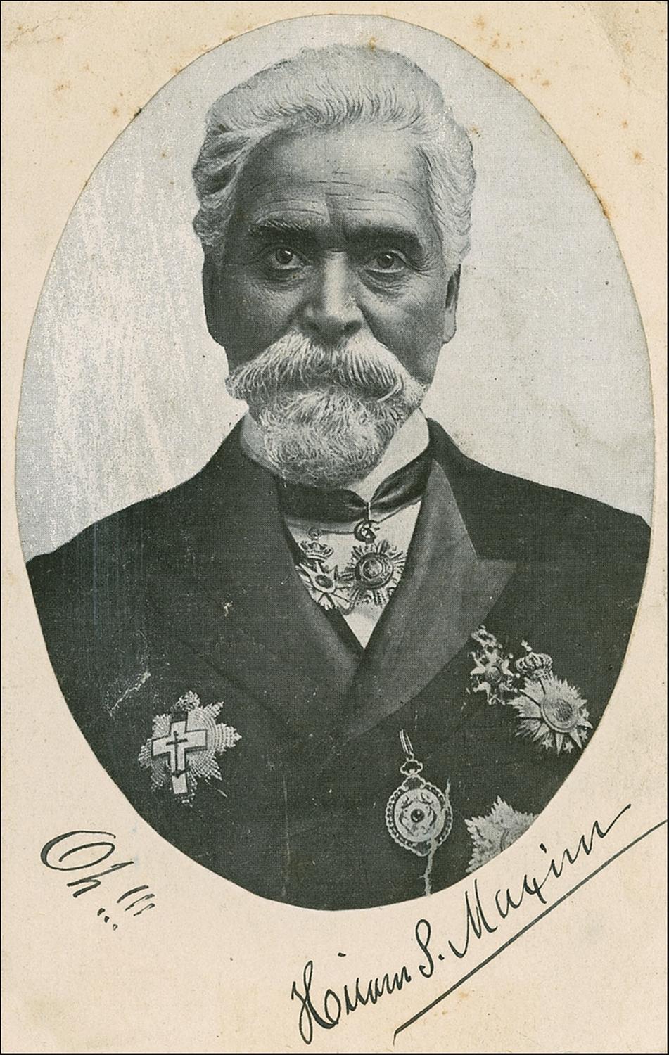 Inventor of the Maxim Gun (1840–1916) who emigrated to England and adopted British citizenship. Fountain pen signature, “Oh!!! Hiram S. Maxim,” on an off-white 3.5 x 5.5 postal card to which a photo has been affixed. In very good condition, with corner creasing and toning, surface marks to the photo, and light rippling.