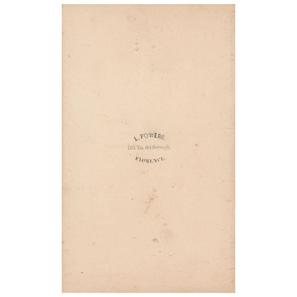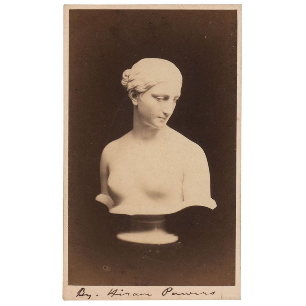 Vintage 2.5 x 4 carte-de-visite photo of a marble bust of The Greek Slave, a sculpture by Hiram Powers, who signs in the lower border in black ink, "By Hiram Powers." Published by L. Powers of Florence. In fine condition.