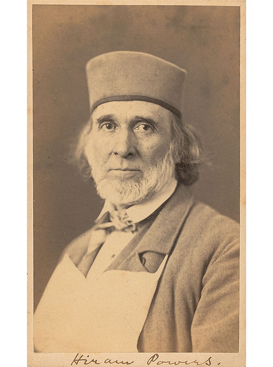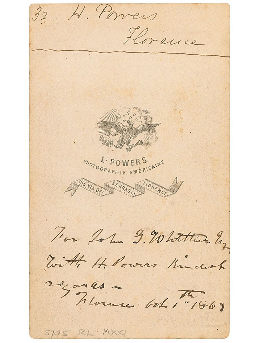 American neoclassical sculptor (1805–1873). Original 2.5 x 4 carte-de-visite portrait by L. Powers of Florence, signed in the lower border in black ink, and signed and inscribed on the reverse to the famous poet, “For John G. Whittier, Esq., with H. Powers’ kindest regards—Florence, Oct. 1th [sic], 1867.” In fine condition, with an ink notation to the upper border on the reverse.
