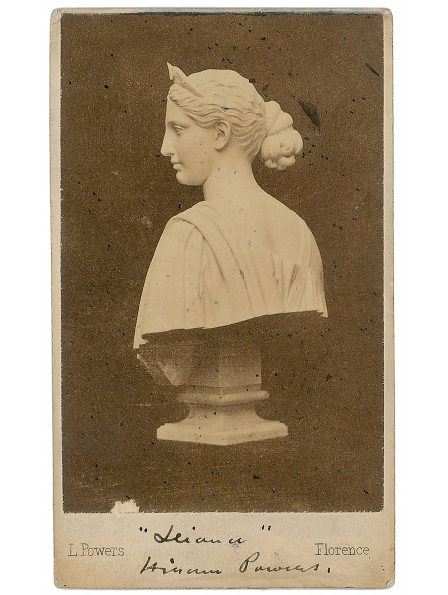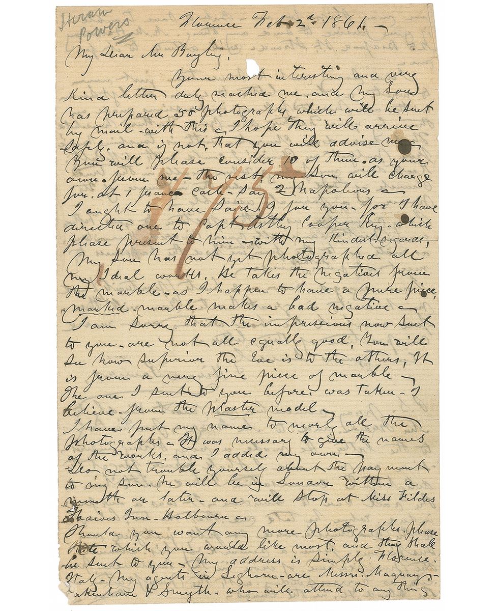 American neoclassical sculptor (1805-1873). Two items: lengthy ALS, one page both sides, 5.25 x 8.25, February 2, 1864. In part: “My son has prepared 50 photographs which will be sent by mail…My son has not yet photographed all my Ideal works. He takes the negatives from the marble—as I happen to have a pure piece, marked marble makes a bad negative…You will see how superior the Eve is to the others. It is from a very fine piece of marble”; and a 2.5 x 4.25 carte-de-visite photograph of one of his sculptures produced by his son, titled and signed on the mount by Powers, “‘Diana,’ Hiram Powers.” Partial separation to one of the letter’s folds, large ink notations to the body of the letter, show-through from writing to opposing sides, a small hole affecting some of the writing, and a chip to the bottom edge of the photo, otherwise overall fine condition.