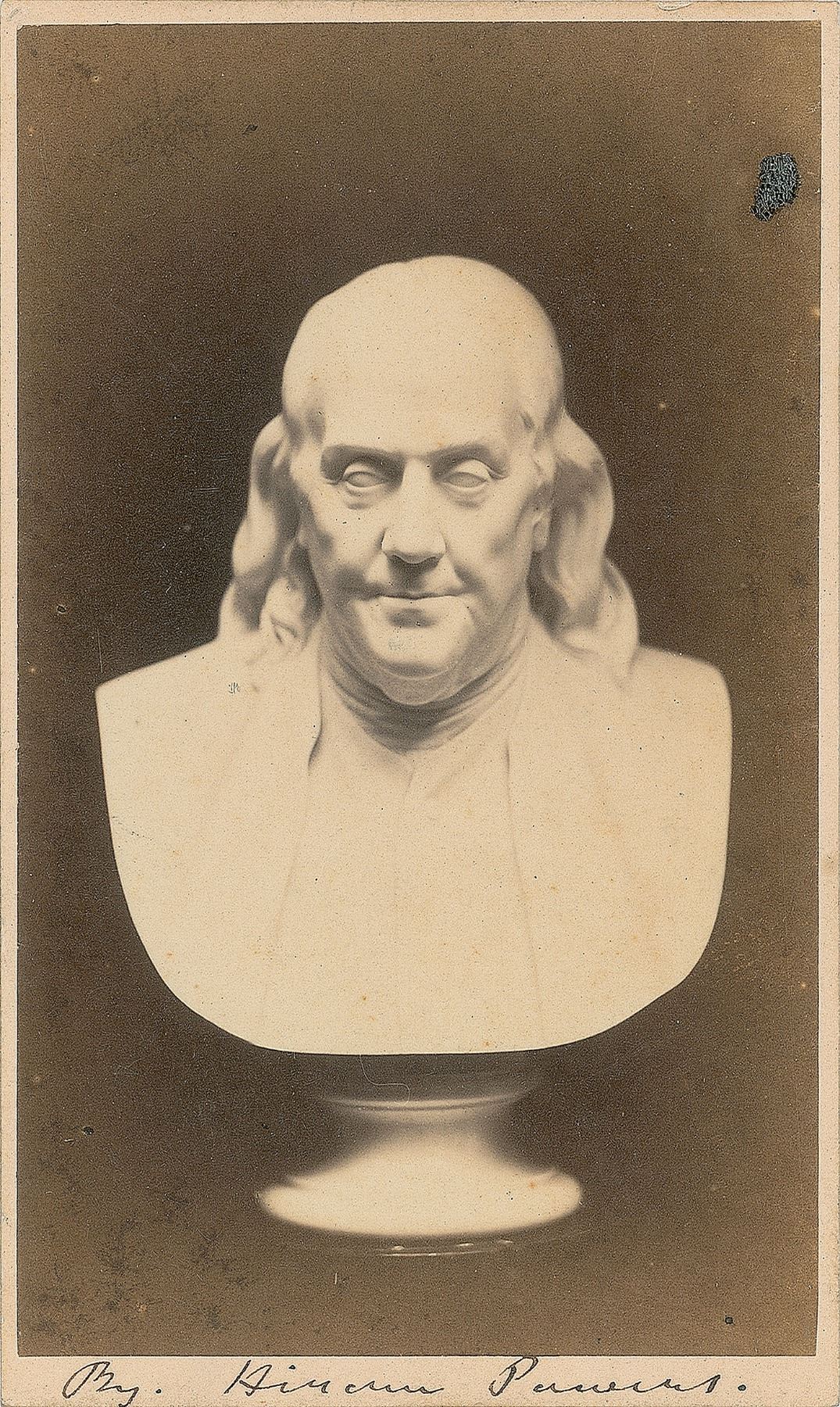 American neoclassical sculptor (1805-1873). Vintage 2.25 x 4 carte-de-visite photo of a bust sculpture of Benjamin Franklin, signed in the lower border in black ink, "By. Hiram Powers." Published by L. Powers of Florence. In fine condition, with a small stain to the upper right.