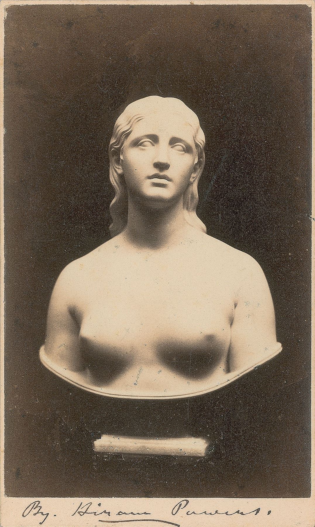 American neoclassical sculptor (1805-1873). Vintage 2.25 x 4 carte-de-visite photo of a bust sculpture of Eve, signed in the lower border in black ink, "By. Hiram Powers." Published by L. Powers of Florence. In fine condition.