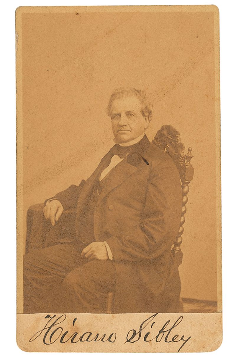 Financier and philanthropist (1807–1888) who helped obtain funding for Samuel Morse’s telegraph wire from Washington to Baltimore, and later served as the president of Western Union. Original 2.5 x 4 carte-de-visite portrait of Sibley seated, by Charles D. Fredricks of New York, signed in the lower border in black ink. In very good condition, with light scattered foxing and toning, silvering to dark areas of the image, and mounting remnants to reverse.