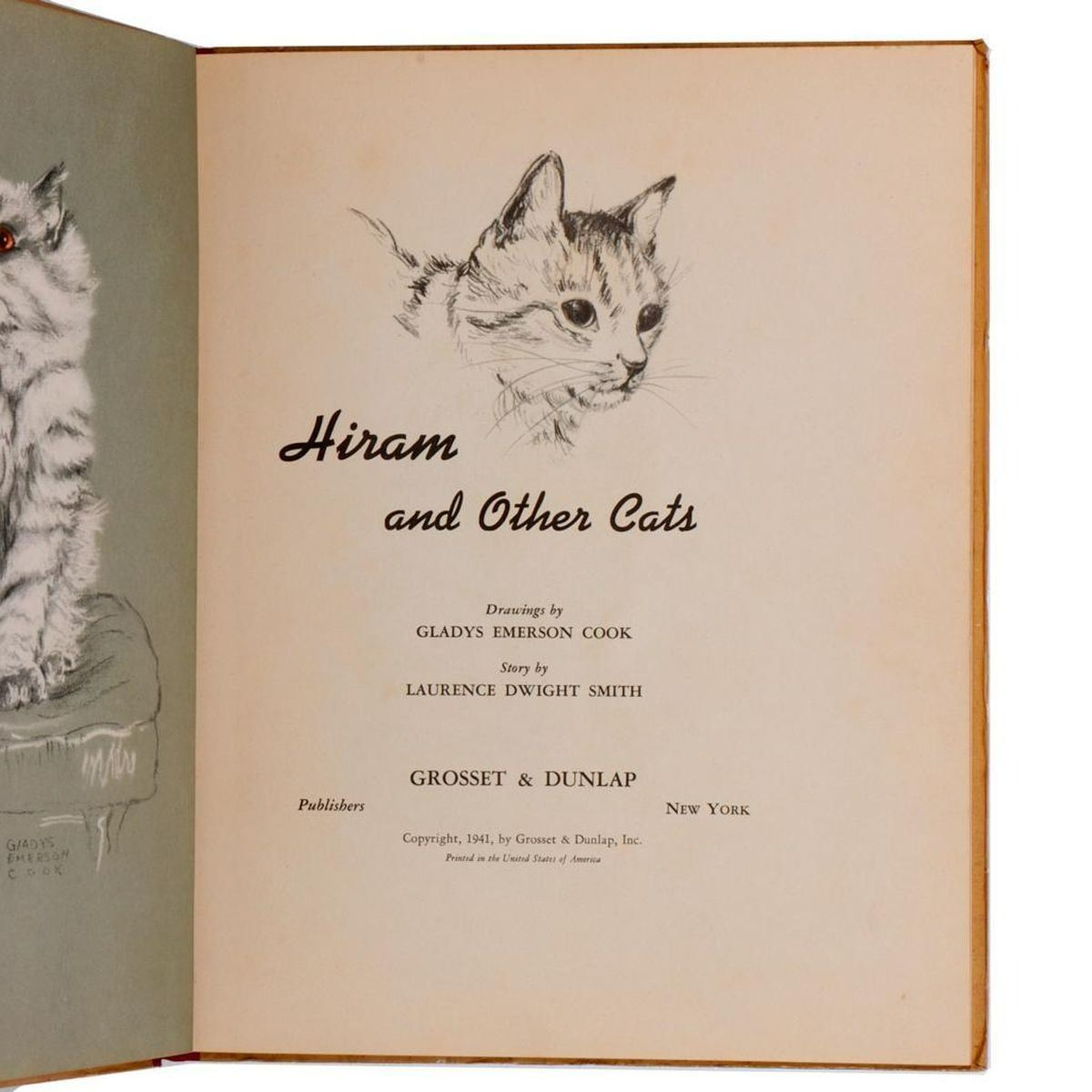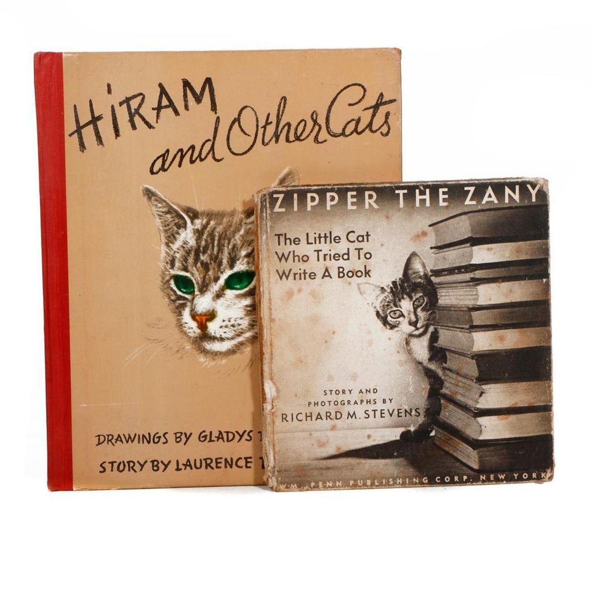 COOK, GLADYS EMERSON, and LAWRENCE DWIGHT SMITH. Hiram and Other Cats. New York: Grosset & Dunlap, 1941. First Edition. 4to. Full-page illustrations. Signed by illustrator on flyleaf: "Hiramatically Yours" with cat doodle. Good; some scuffing/corner wear, light toning. Together with: STEVENS, RICHARD M. Zipper the Zany, the Little Cat Who Tried to Write a Book. New York: WM. Penn Publishing Corp, 1945. Condition Poor-Fair, including splitting and a half torn/missing page, but the rest of the charming photo illustrations are good.